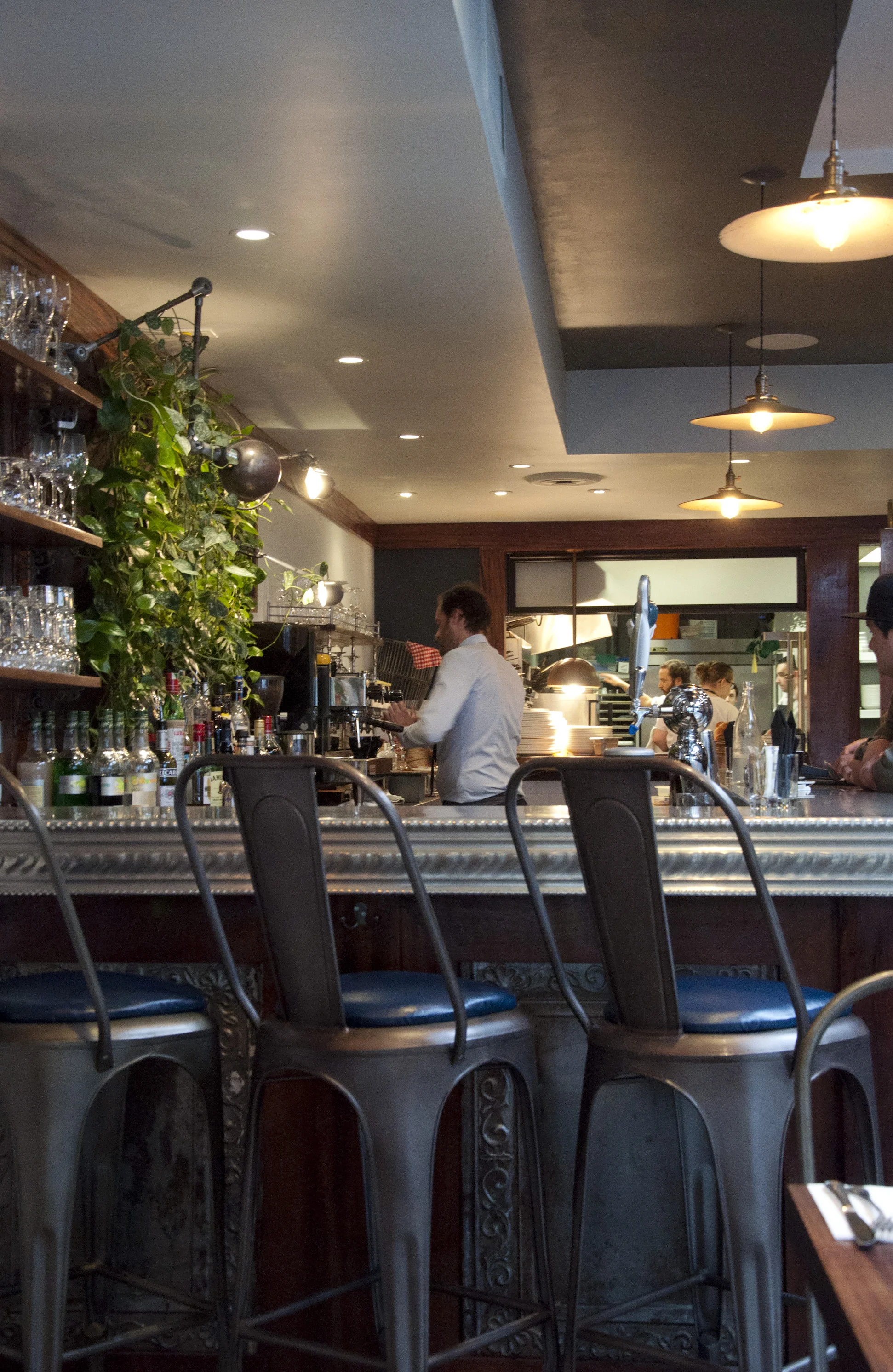The Parisian illusion starts with the bistro seats on the narrow patio that overlooks 4th Avenue. On opening the doors, you will be greeted by friendly, charming waiters with perfect French accents. A bank of tables on one side of the restaurant with blue leather bench searing provides for perfect people watching. The other rows of tables (with cast iron Singer sewing machine legs) provide more seating. The shiny tin bar adds sparkle and a little je ne sais quoi.