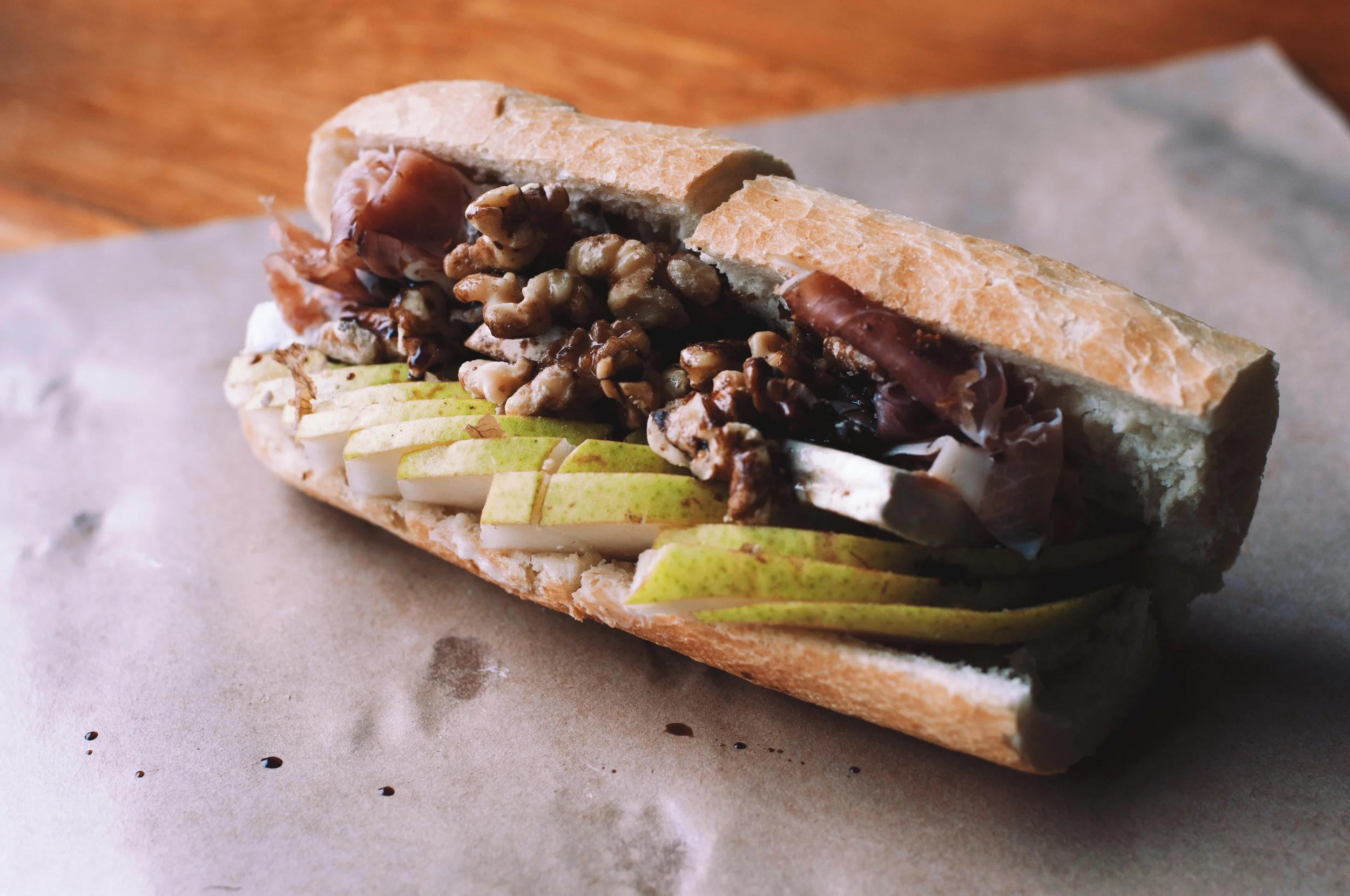 We strongly recommend the pear and proscuitto baguette with a chocolate chip cookie for dessert. And if you'd prefer your food to go, have it wrapped to go in a brown paper package tied up with string.
